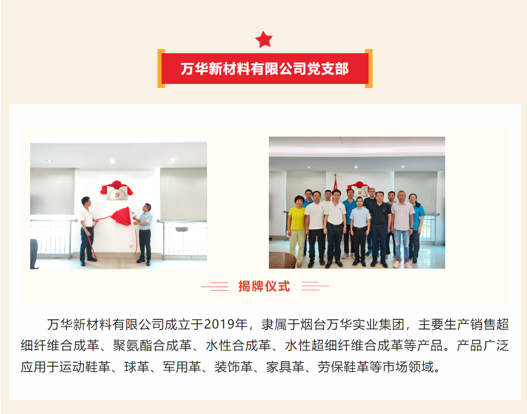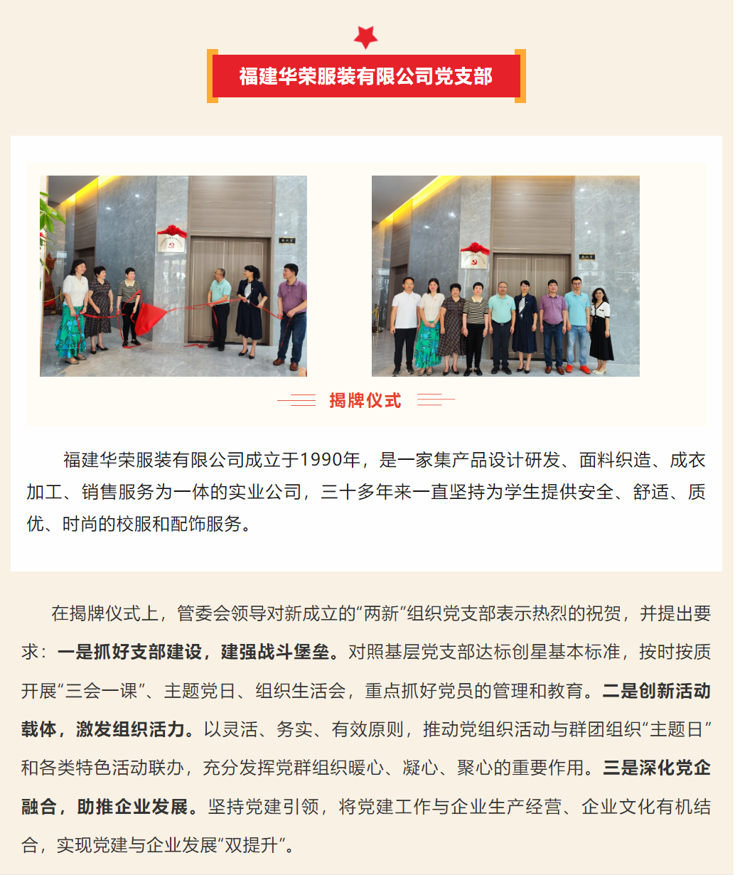 為深入貫徹落實(shí)黨的二十大精神,進(jìn)一步加強(qiáng)“兩新”組織黨建工作,以高質(zhì)量黨建引領(lǐng)“兩新”組織高質(zhì)量發(fā)展,近日,惠安經(jīng)濟(jì)開發(fā)區(qū)新成立萬華新材料有限公司黨支部和福建華榮服裝有限公司黨支部。惠安經(jīng)濟(jì)開發(fā)區(qū)黨委副書記、管委會副主任劉書藝、林志杰出席揭牌儀式。